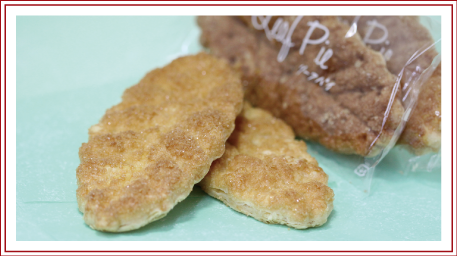 葉っぱの形をした焼き菓子です。パイならではのサックリとした独特な食感と軽い口当たり、表面にまぶした砂糖の粒との食感が調和して、美味しさをより一層際立てます。紅茶やミルクなどの飲み物にも相性ピッタリです。 |